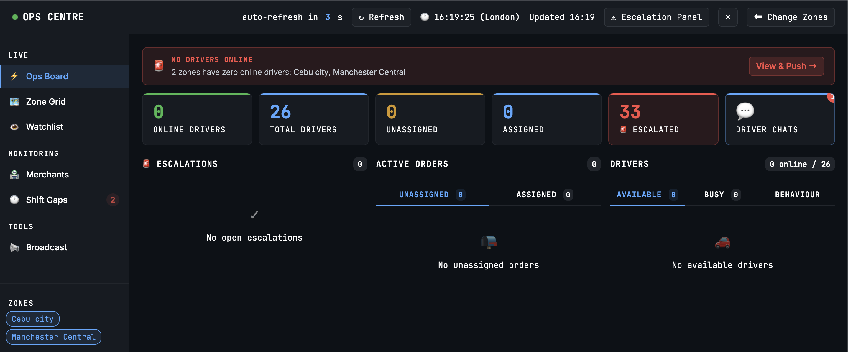 A full-replacement live map and driver operations dashboard. v2.3.9: Complete rework of chat seen-state. seenTs is now purely DB-driven (never mutated by alert handler). alertedThisSession Set prevents repeat toasts without corrupting seenTs. openConvFromDrawer writes markchatseen to DB and localStorage. Badge and number persist correctly across reloads and fresh logins. v2.3.4: Adds driverops_chat_seen table. v2.3.3: Zone picker redesigned as cascading dropdowns. Requires Advanced Zone v1.0.9.